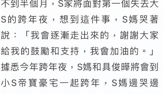 在接受台媒采访大S去世后,第一个没有她的跨年夜会如何过时,黄春梅哭着说自己会走出来,打算在小S家和具俊晔一起过。从始至终都没有提及大S的两个孩子,完全忘了她们。